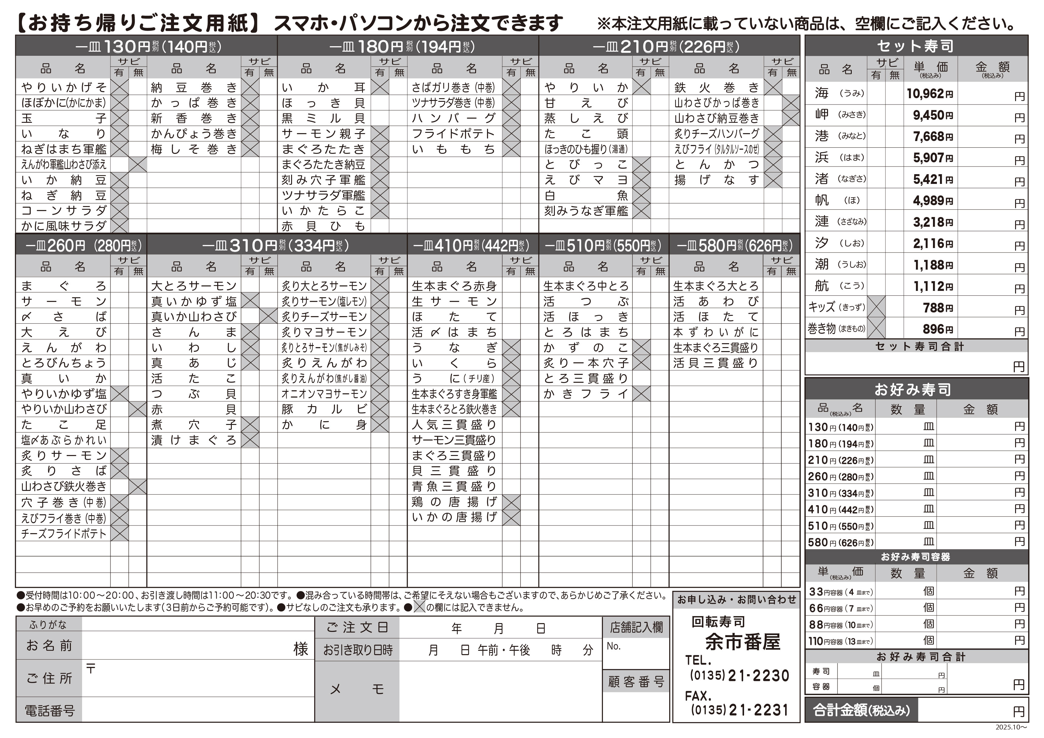 お持ち帰りご注文用紙